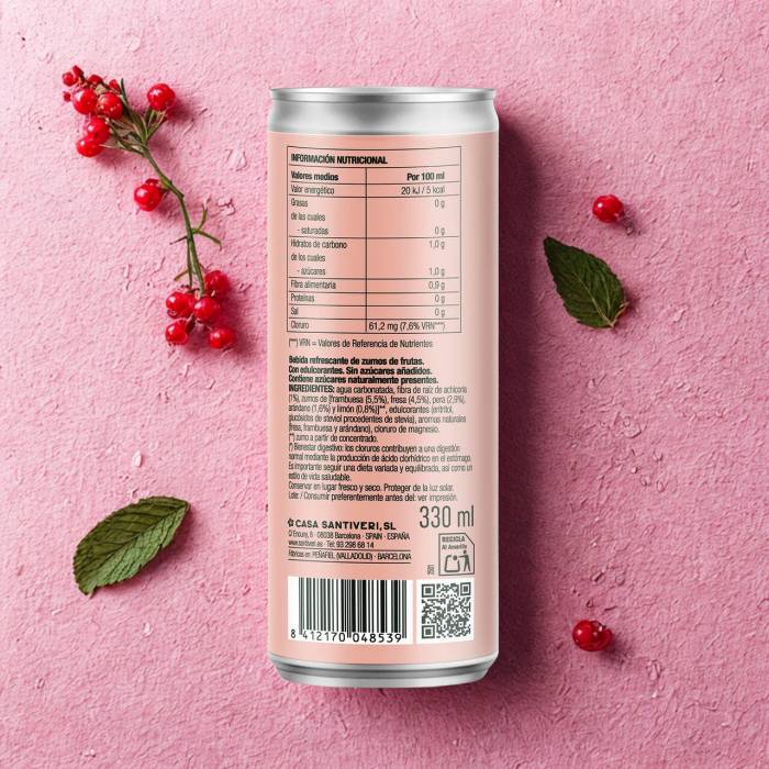 Refresco con zumo natural de frutos rojos, con burbujas y fibra prebiótica de achicoria. Solo 19 kcal por lata y 3 g de azúcar procedente del zumo, sin azúcar añadido ni edulcorantes artificiales. Bajo en calorías, sin gluten y apto para veganos. Sabor intenso y equilibrado que cuida tu microbiota sin renunciar al placer.