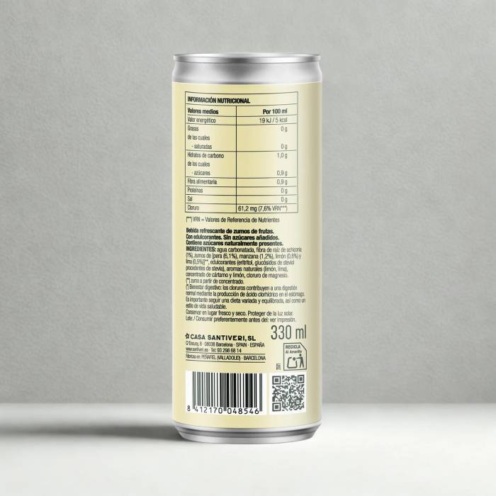 Es baja en azúcares y calorías, con menos de 19 kcal por lata y solo 3 g de azúcar procedente exclusivamente del zumo de fruta. No contiene azúcar añadido ni edulcorantes artificiales como aspartamo, sucralosa o acesulfamo K. Está endulzada únicamente con eritritol y stevia.