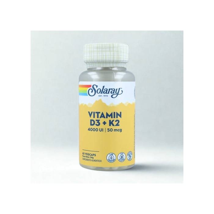 Vitamina D3 + K2 Solaray es un complemento alimenticio de alta calidad formulado para apoyar la salud ósea, el sistema inmunitario y el correcto metabolismo del calcio. Su combinación de vitamina D3 4000 UI y vitamina K2 MK-7 ayuda a mejorar la absorción del calcio y a dirigirlo hacia los huesos y dientes, favoreciendo su correcta mineralización.